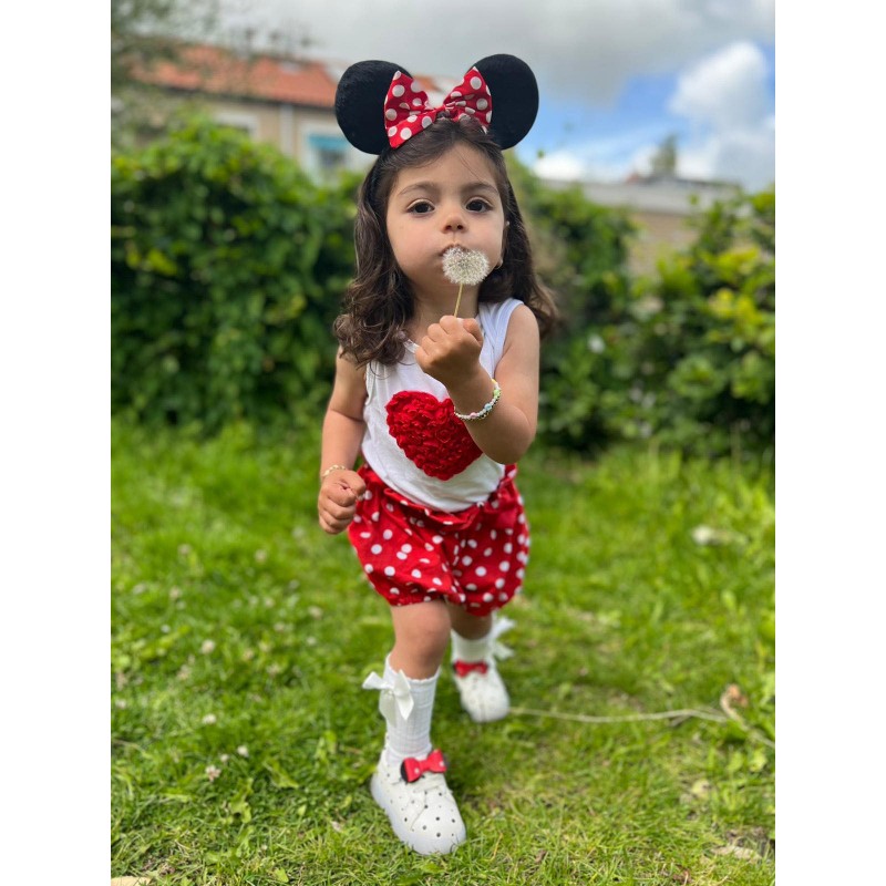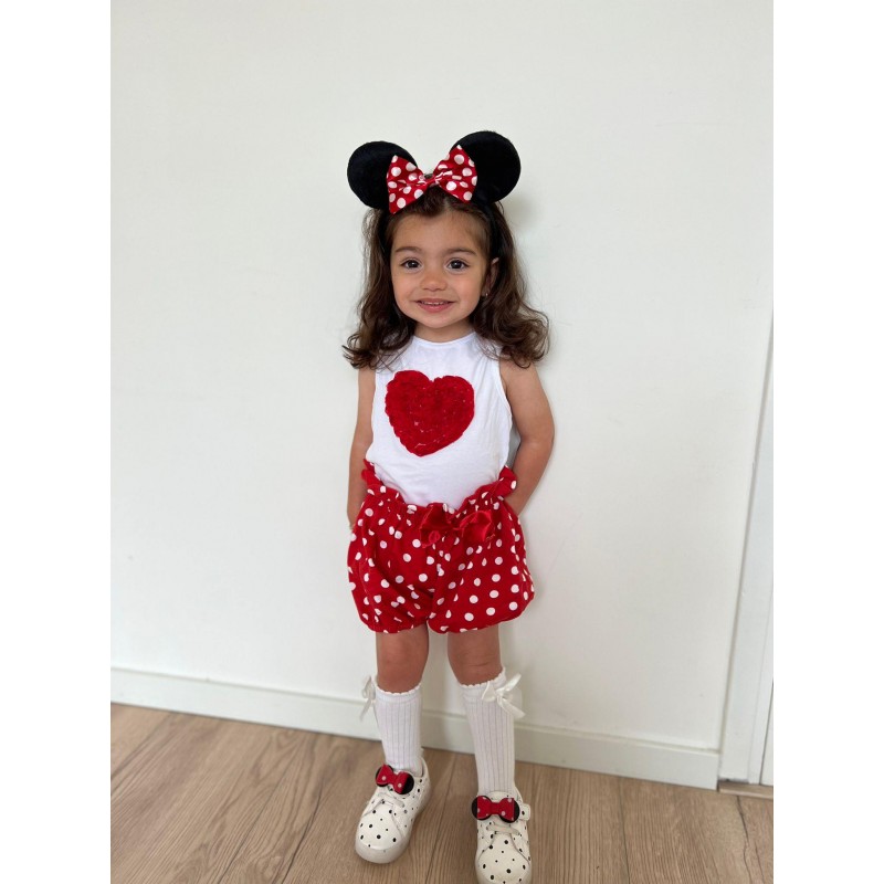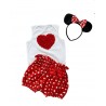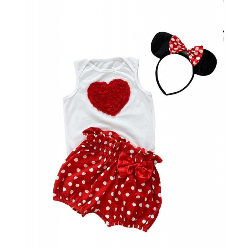 De kledingset bevat een rompertje met korte mouwen, shorts en haarband.